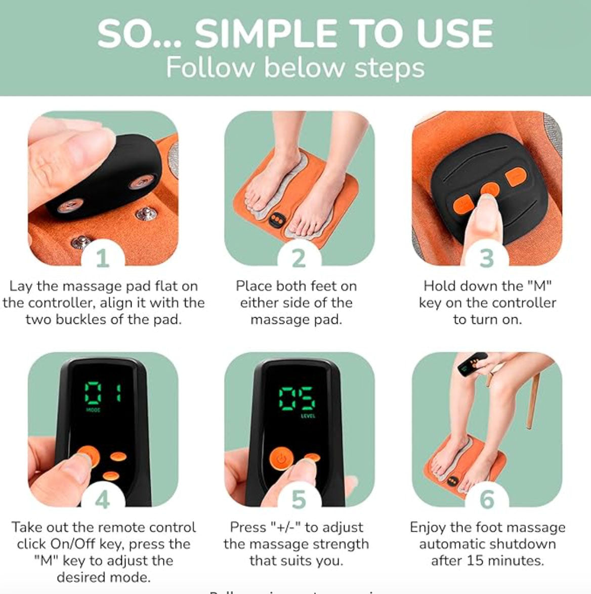 • STEP 3: Once you've selected your settings, simply press the start button to begin the massage session. Relax and let the Nooro™ 3-in-1 Leg Massager gently compress and heat your legs. For optimal results, use the device for 10-15 minutes per session.